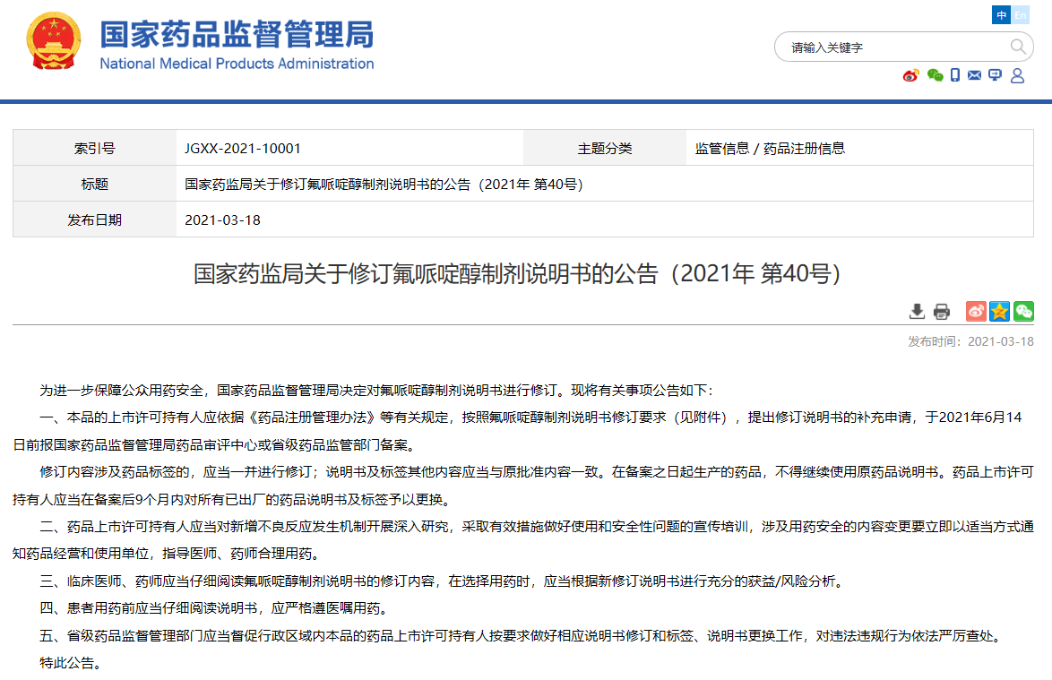 關于修訂氟哌啶醇制劑說明書的公告(2021年 第40號)