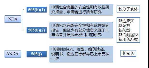 在美國,505法案(即《聯邦食品、藥品、化妝品法案》第5章第505分章)中,化學藥品可分為以下3種申請類別,其中NDA包括505(b)(1)和505(b)(2),ANDA為505(j)。
