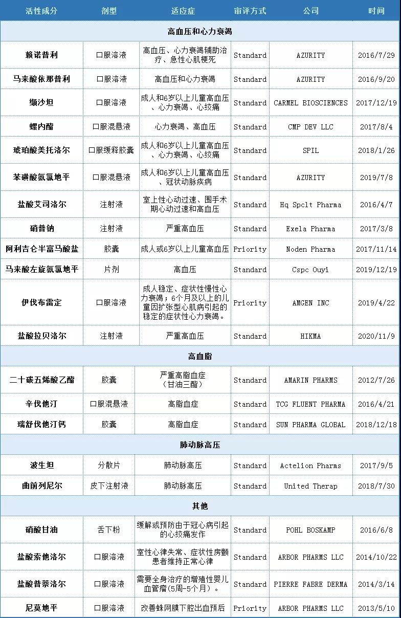 另外,該領域的較多品種均納入了《國家鼓勵研發申報的兒童藥品》,例如尼莫地平(第一批)、普萘洛爾(第二批)、氨氯地平(第二批)、依那普利(第三批)、索他洛爾(第三批)、螺內酯(第三批)口服液體制劑等,建議企業可以重點關注。