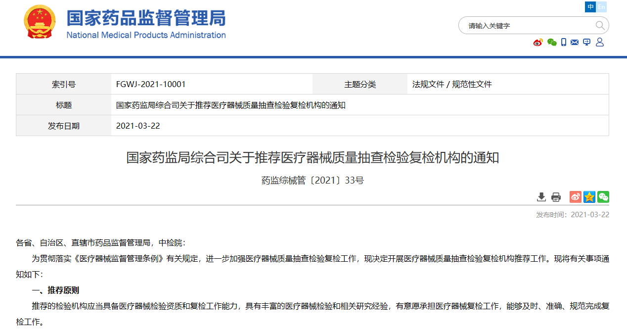 國家藥監局綜合司關于推薦醫療器械質量抽查檢驗復檢機構的通知