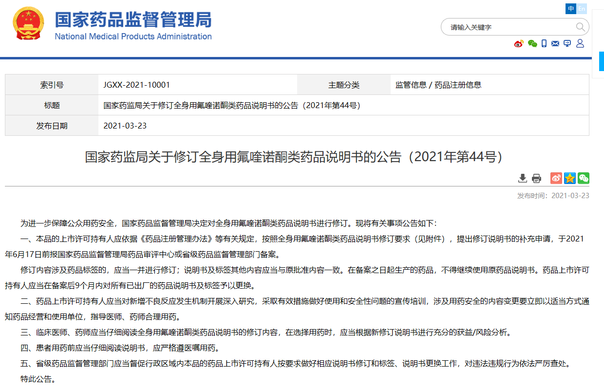 國家藥監局關于修訂全身用氟喹諾酮類藥品說明書的公告(2021年第44號)