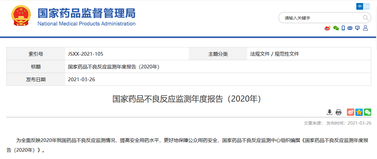 國家藥品不良反應監測年度報告(2020年)
