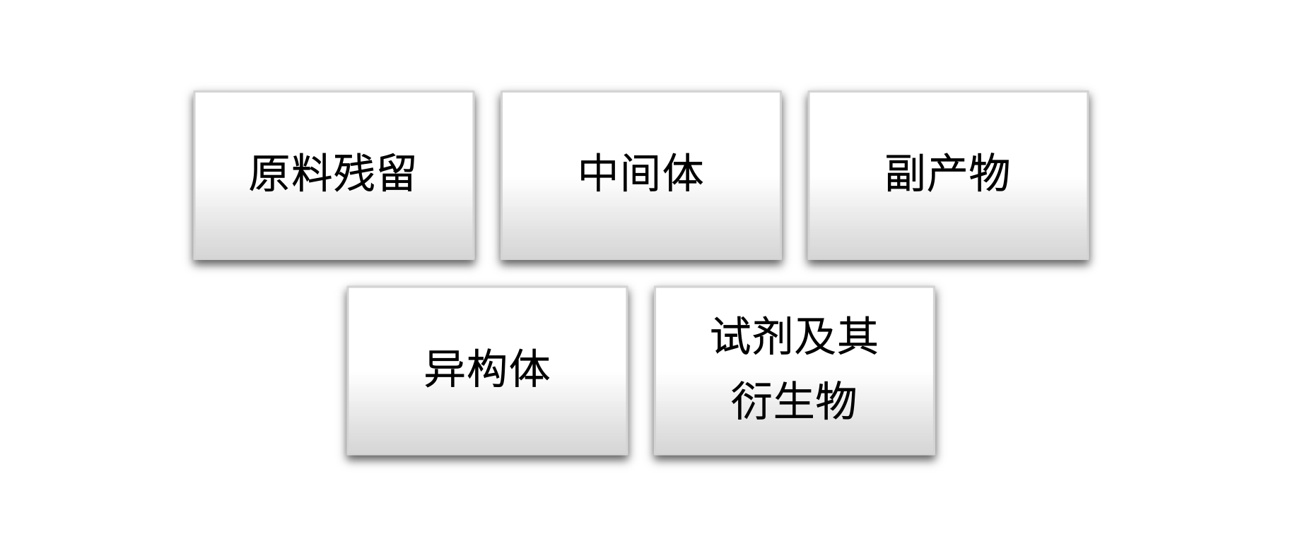 根據原料藥的合成工藝,結合藥典(包括USP, EP, ChP, JP等)收載相關雜質對其中可能存在的有機雜質進行了理論分析和檢測,確定是否訂入標準進行常規控制。可能存在的有機雜質有: