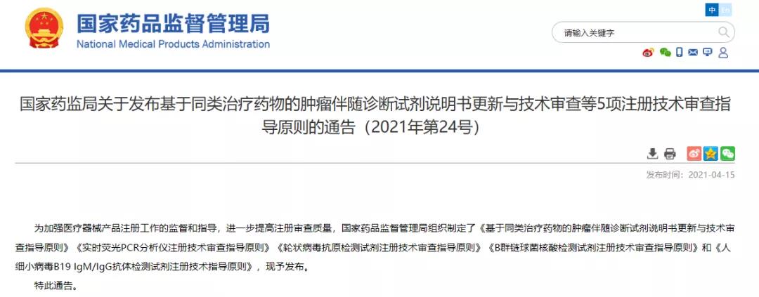 國(guó)家藥監(jiān)局關(guān)于發(fā)布基于同類治療藥物的腫瘤伴隨診斷試劑說(shuō)明書更新與技術(shù)審查等5項(xiàng)注冊(cè)技術(shù)審查指導(dǎo)原則的通告(2021年第24號(hào))