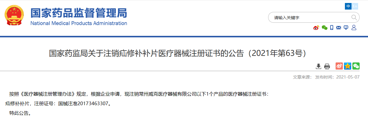 關于注銷疝修補補片醫(yī)療器械注冊證書的公告(2021年第63號)