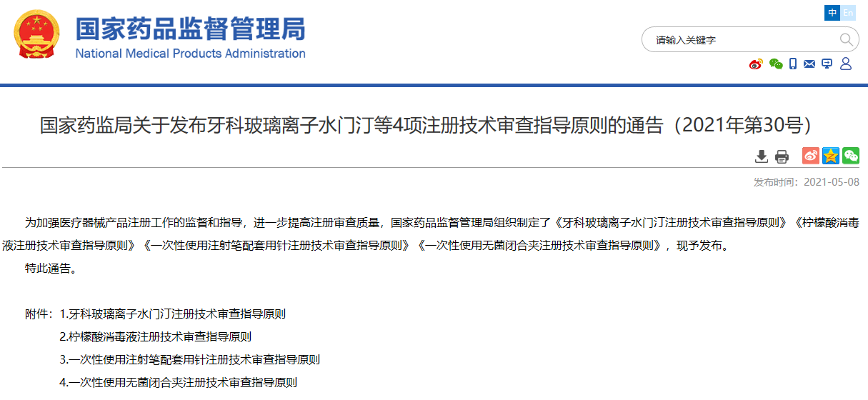 關于發(fā)布牙科玻璃離子水門汀等4項注冊技術審查指導原則的通告(2021年第30號)