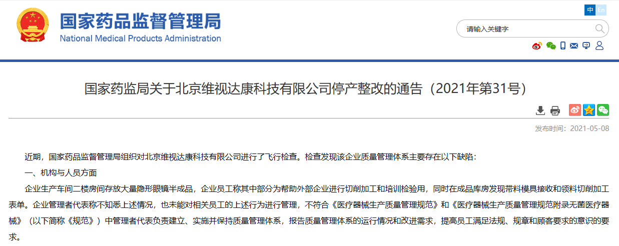 關于北京維視達康科技有限公司停產(chǎn)整改的通告(2021年第31號)