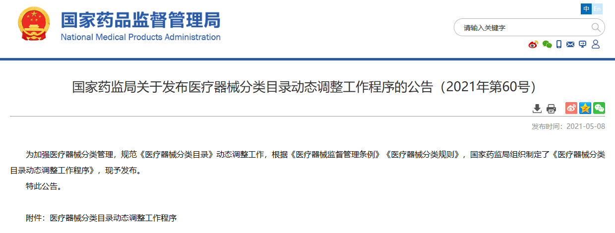 關于發(fā)布醫(yī)療器械分類目錄動態(tài)調(diào)整工作程序的公告(2021年第60號)