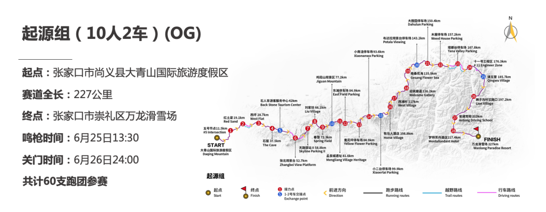 今年的比賽共設3個組別:10人2車起源組:起點為尚義縣大青山國際旅游度假區,終點為崇禮區萬龍滑雪場,賽道總里程為227公里,鳴槍時間為6月25日13:30,關門時間為6月26日24:00。起源組共計60支跑團參賽,相比2020年提升了20支跑團。