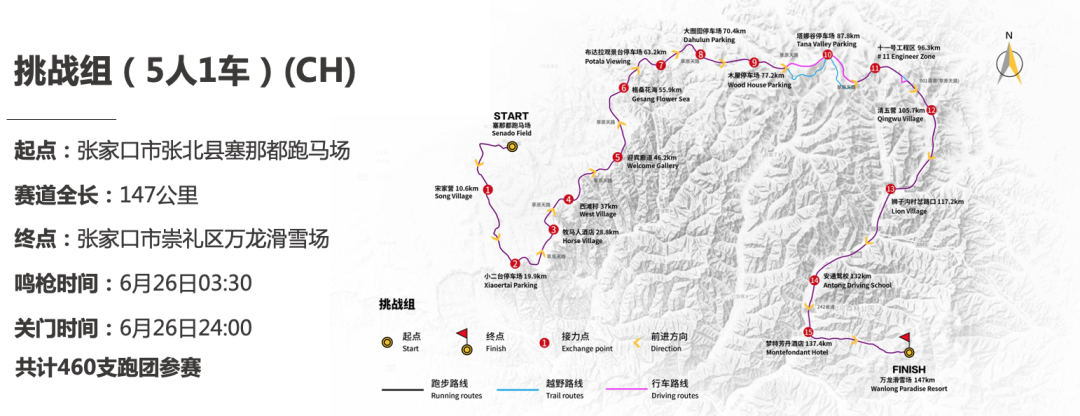 5人1車挑戰組:起點為張北縣塞那都跑馬場,終點為崇禮區萬龍滑雪場,賽道總里程為147公里,鳴槍時間為6月26日03:30,關門時間為6月26日24:00。挑戰組共計460支跑團參賽,相比2020年提升了60支跑團。