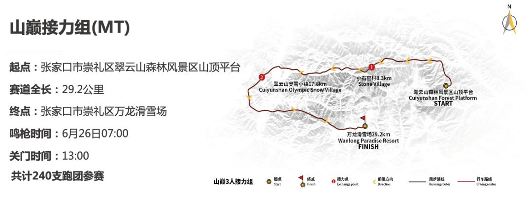 除了以上兩個組別以外,今年我們還為一直以來想體驗越山向海,但又對百公里的距離心生敬畏的跑友們開設了山巔接力組,該組別的起點位于崇禮區翠云山森林風景區山頂平臺,終點為崇禮區萬龍滑雪場,賽道全長29.2公里,鳴槍時間為6月26日早上7點,關門時間為下午1點。