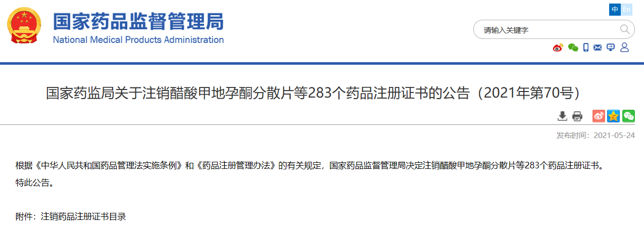 國家藥監局關于注銷醋酸甲地孕酮分散片等283個藥品注冊證書的公告(2021年第70號)