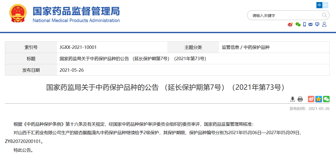 國家藥監局關于中藥保護品種的公告 (延長保護期第7號)(2021年第73號)