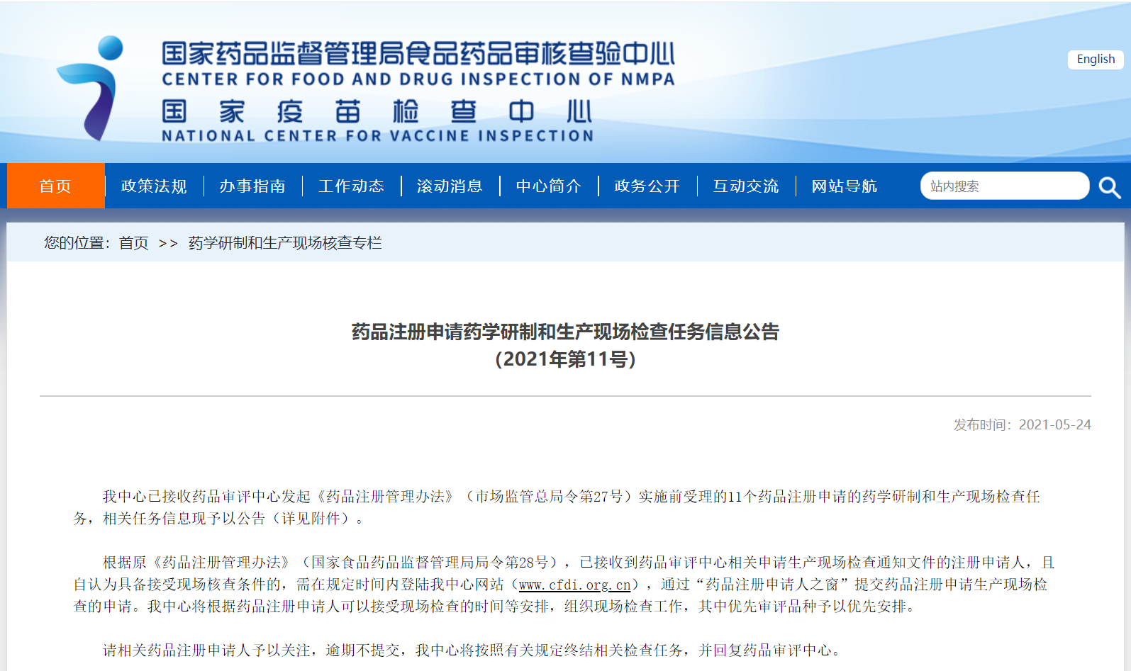 藥品注冊申請藥學研制和生產現場檢查任務信息公告(2021年第11號)