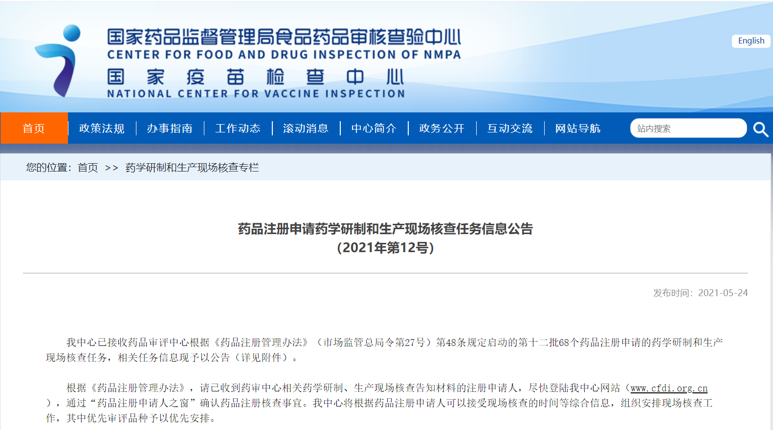 藥品注冊申請藥學研制和生產現場核查任務信息公告(2021年第12號)