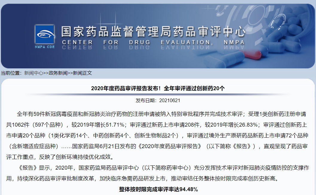 2020年度藥品審評報告發布!全年審評通過創新藥20個