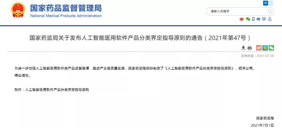 國(guó)家藥監(jiān)局關(guān)于發(fā)布人工智能醫(yī)用軟件產(chǎn)品分類界定指導(dǎo)原則的通告(2021年第47號(hào)) (2021-07-08)