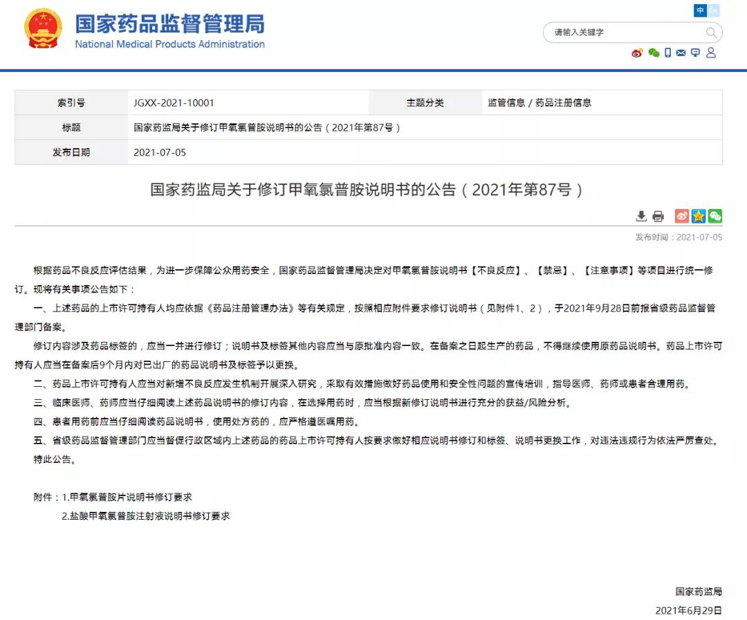 國(guó)家藥監(jiān)局關(guān)于修訂甲氧氯普胺說(shuō)明書(shū)的公告(2021年第87號(hào)) (2021-07-05)