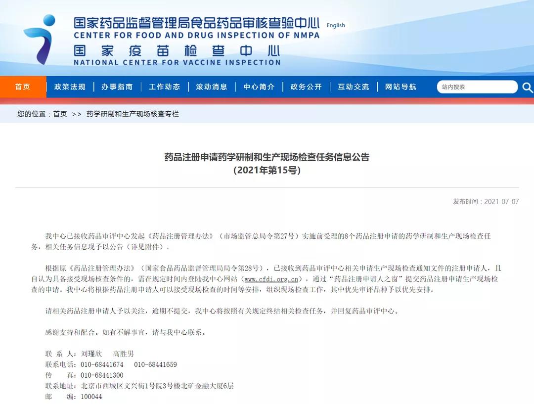 藥品注冊(cè)申請(qǐng)藥學(xué)研制和生產(chǎn)現(xiàn)場(chǎng)檢查任務(wù)信息公告(2021年第15號(hào))