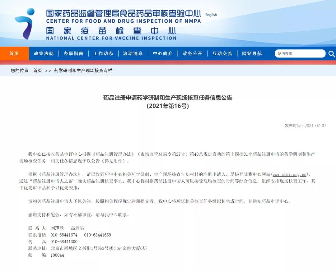 藥品注冊(cè)申請(qǐng)藥學(xué)研制和生產(chǎn)現(xiàn)場(chǎng)核查任務(wù)信息公告(2021年第16號(hào))