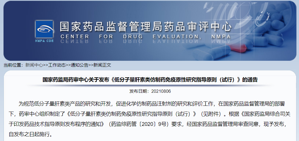 關于發布《低分子量肝素類仿制藥免疫原性研究指導原則(試行)》的通告