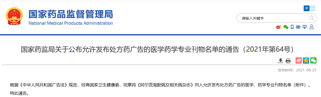 關(guān)于公布允許發(fā)布處方藥廣告的醫(yī)學藥學專業(yè)刊物名單的通告(2021年第64號)
