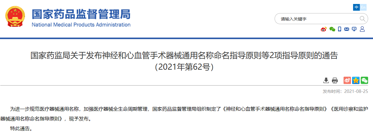 關(guān)于發(fā)布神經(jīng)和心血管手術(shù)器械通用名稱命名指導(dǎo)原則等2項指導(dǎo)原則的通告(2021年第62號)