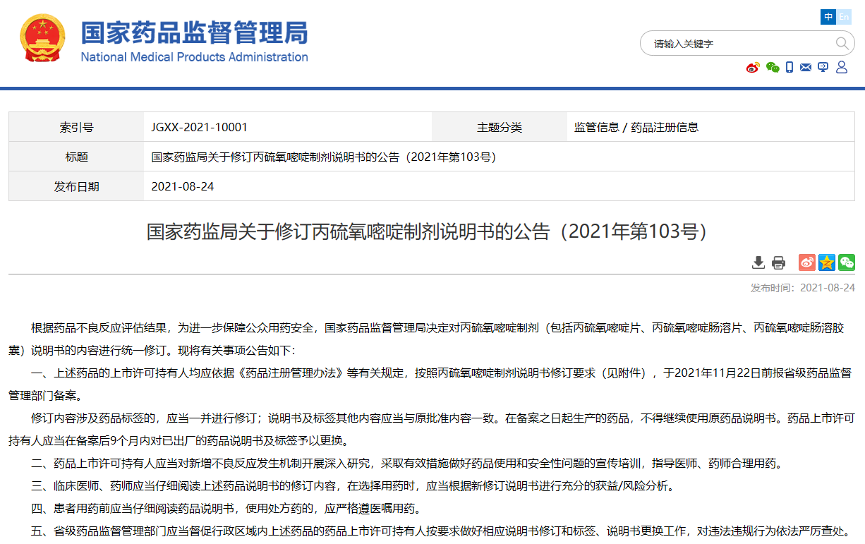關(guān)于修訂丙硫氧嘧啶制劑說明書的公告(2021年第103號)