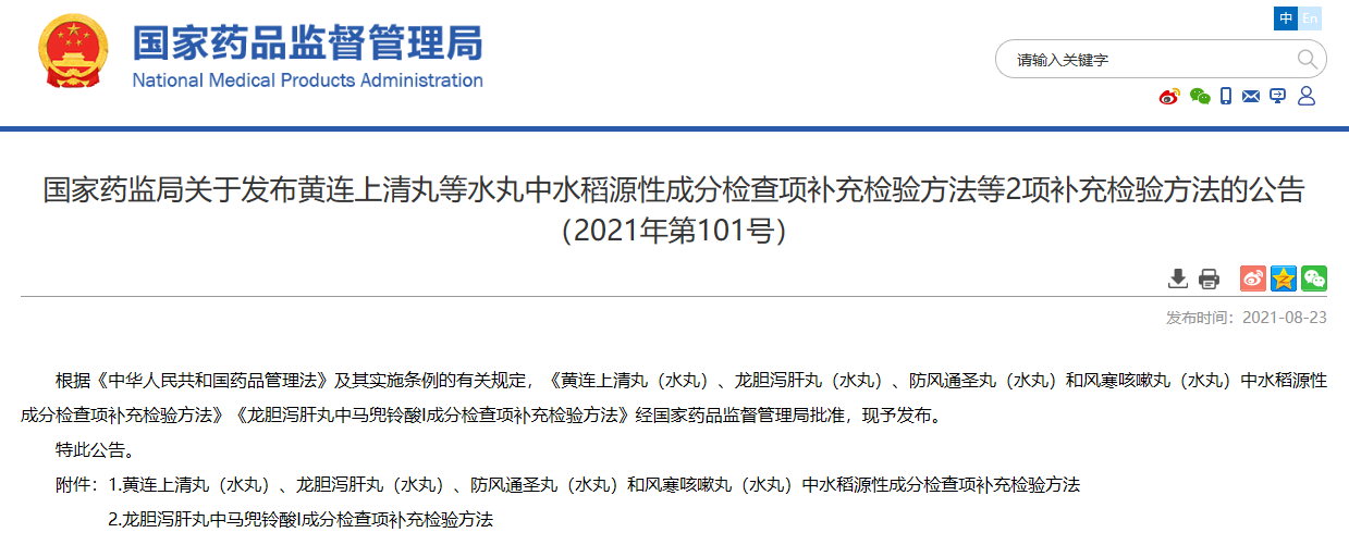 關(guān)于發(fā)布黃連上清丸等水丸中水稻源性成分檢查項補充檢驗方法等2項補充檢驗方法的公告(2021年第101號)