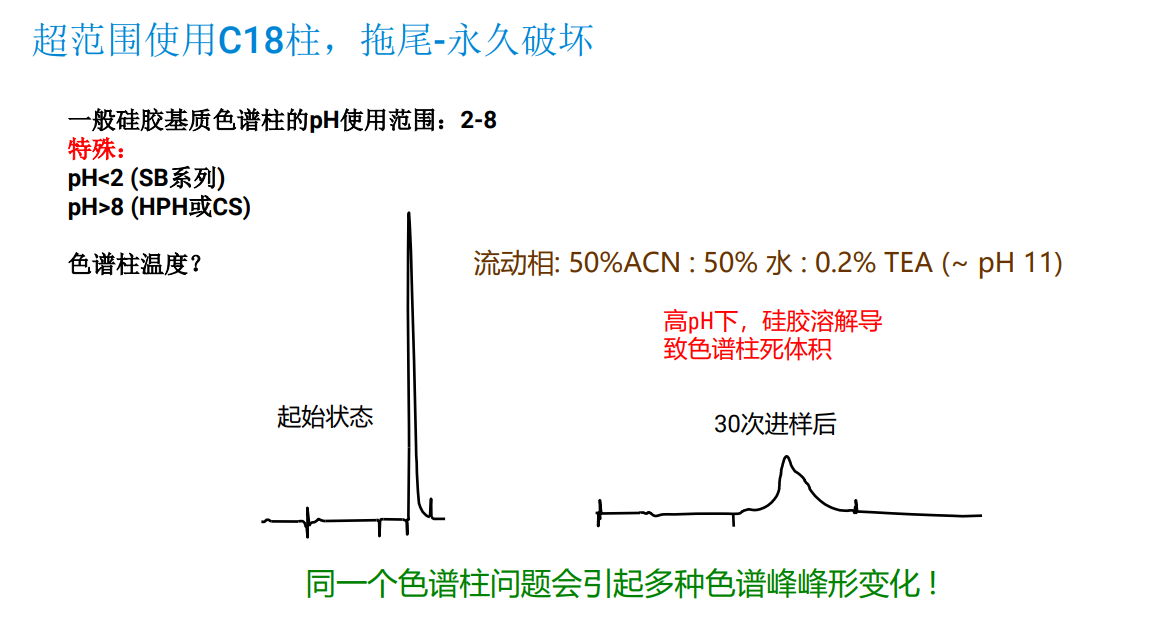 液相色譜柱使用過程中最常見的問題包括pH值、溫度、溶劑耐受、壓力、樣品等。色譜柱使用條件不得超出廠家建議的范圍,包括最高壓力,pH范圍,水相耐受,柱溫等。當測試條件接近色譜柱使用范圍的極限值時,柱壽命會受影響。