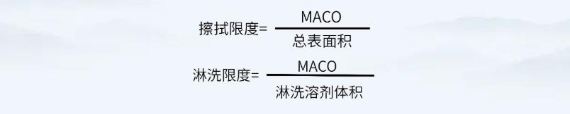 通過(guò)上述公式,確定MACO值后,即可通過(guò)如下公式,計(jì)算擦拭法及淋洗法的殘留可接受標(biāo)準(zhǔn)。