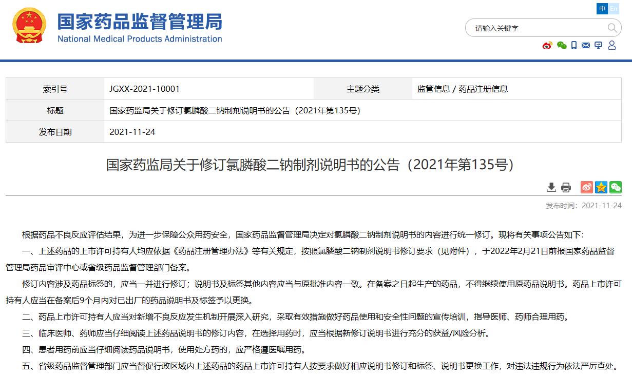 國家藥監局關于修訂氯膦酸二鈉制劑說明書的公告(2021年第135號)