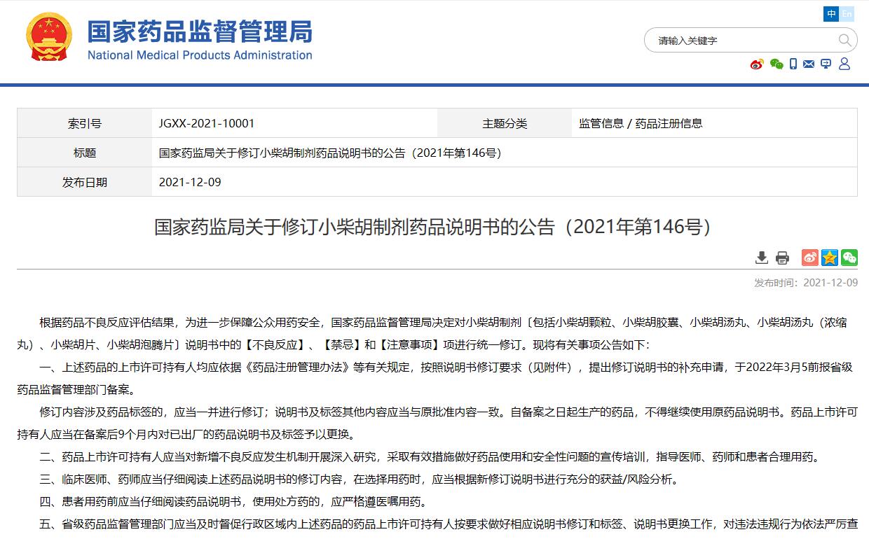 國家藥監局關于修訂小柴胡制劑藥品說明書的公告(2021年第146號)