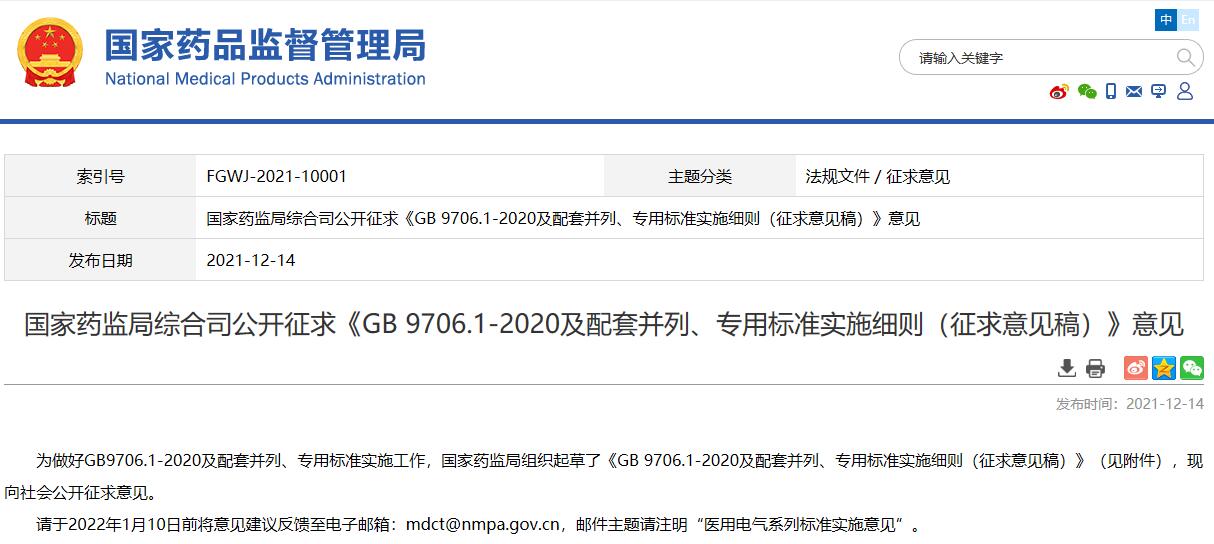 國家藥監局綜合司公開征求《GB 9706.1-2020及配套并列、專用標準實施細則(征求意見稿)》意見