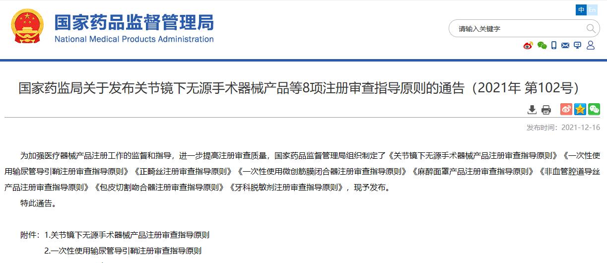 國家藥監局關于發布關節鏡下無源手術器械產品等8項注冊審查指導原則的通告(2021年 第102號)