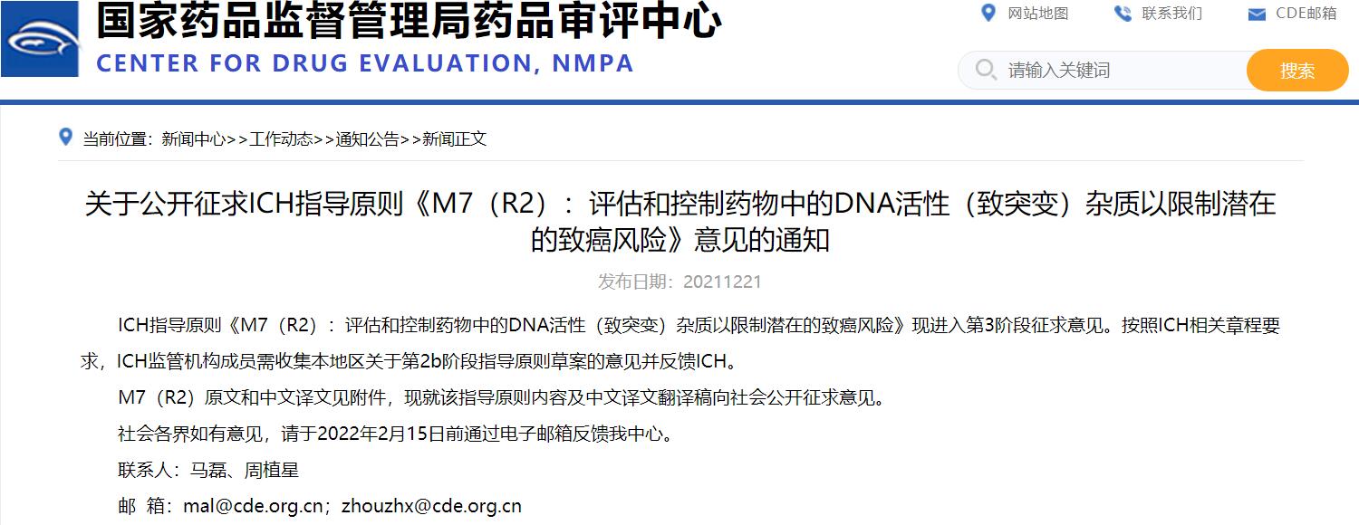 關于公開征求ICH指導原則《M7(R2):評估和控制藥物中的DNA活性(致突變)雜質以限制潛在的致癌風險》意見的通知