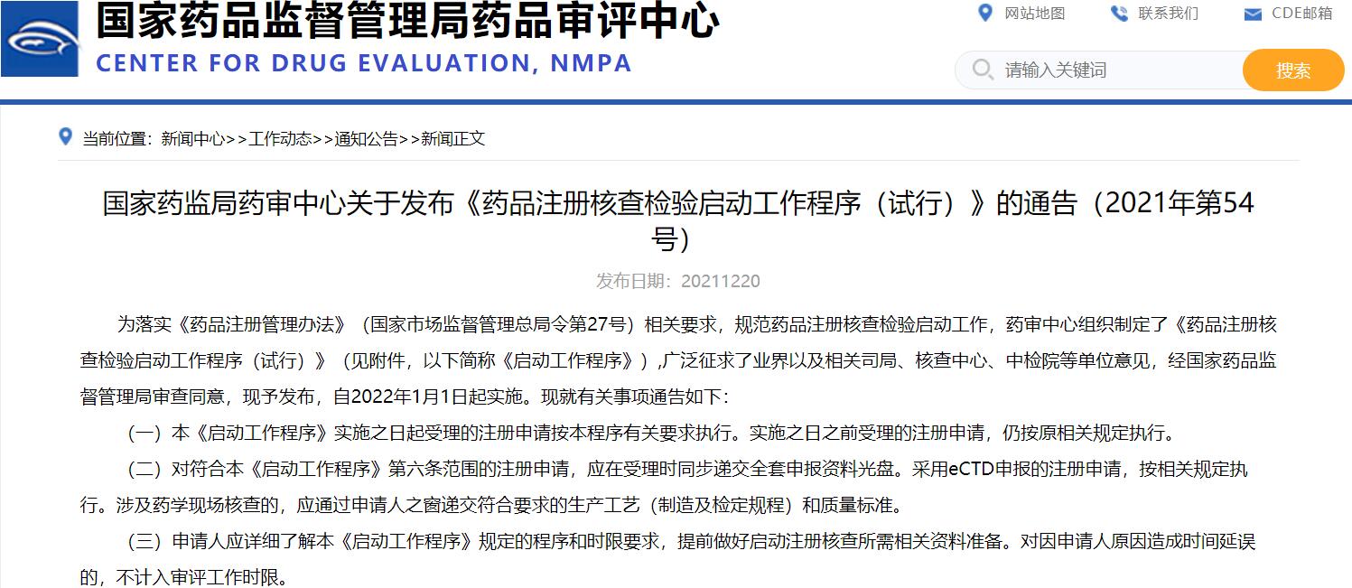 國家藥監局藥審中心關于發布《藥品注冊核查檢驗啟動工作程序(試行)》的通告(2021年第54號)