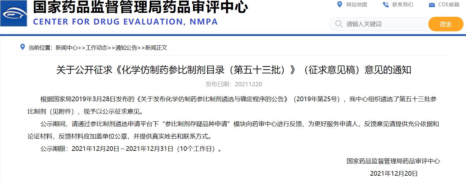 關于公開征求《化學仿制藥參比制劑目錄(第五十三批)》(征求意見稿)意見的通知