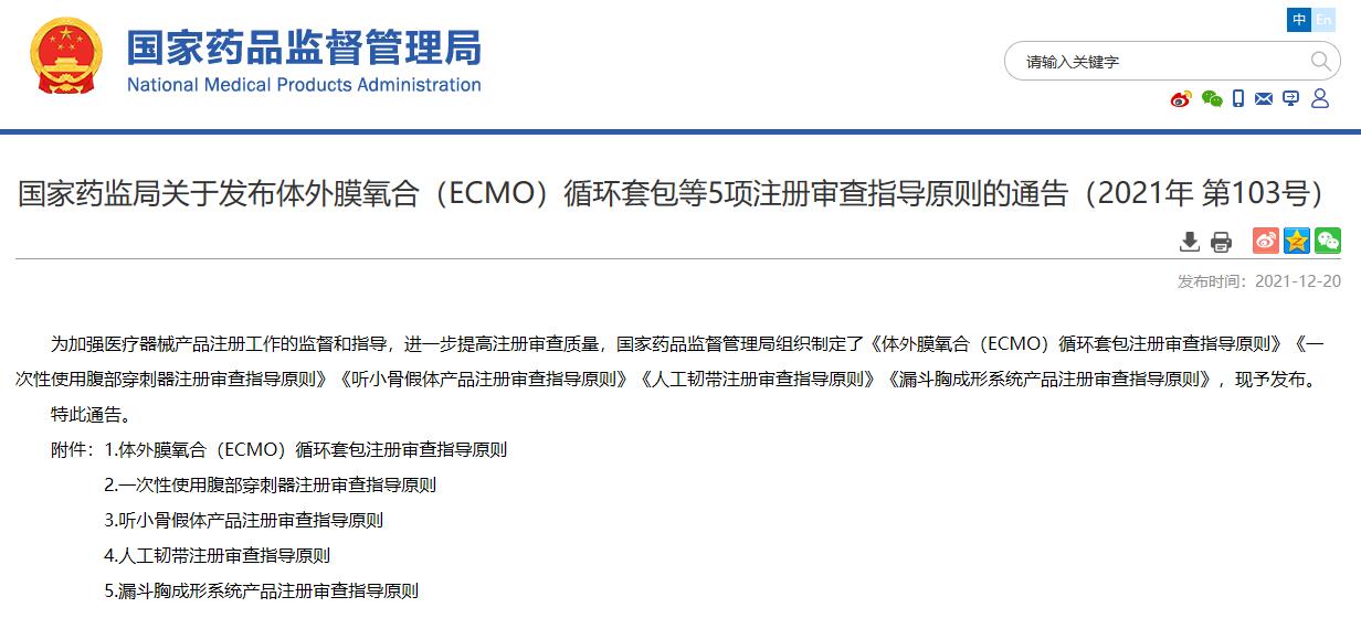 國家藥監局關于發布體外膜氧合(ECMO)循環套包等5項注冊審查指導原則的通告(2021年 第103號)