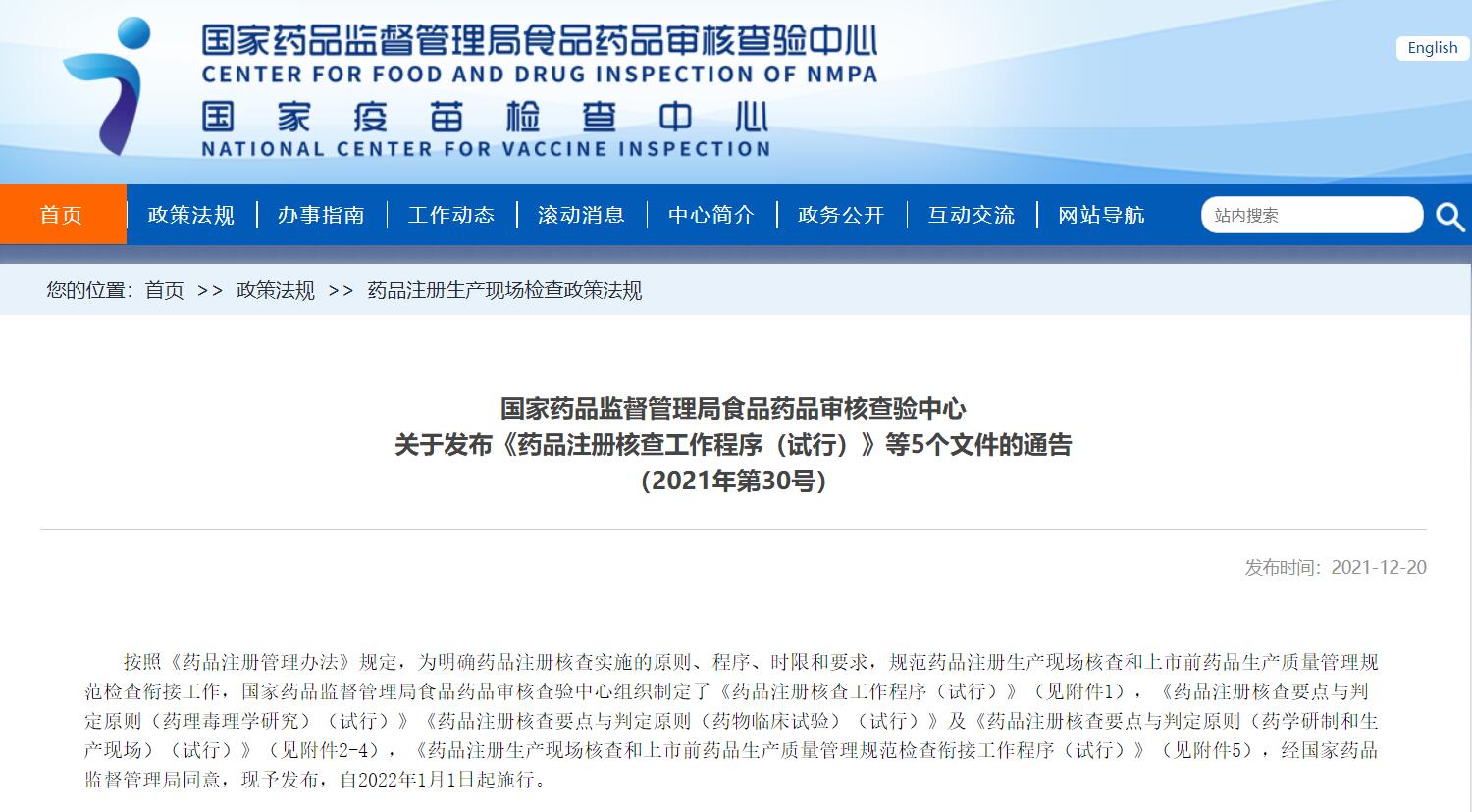 國家藥品監督管理局食品藥品審核查驗中心關于發布《藥品注冊核查工作程序(試行)》等5個文件的通告(2021年第30號)