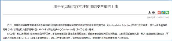 2021年,CDE發布兩則關于罕見病用藥的臨床研發指導原則,通過優先審評審批方式批準2款罕見病用藥,分別為奧法妥木單抗注射液(用于治療成人復發型多發性硬化(RMS)) 和注射用司妥昔單抗(用于人體免疫缺陷病毒(HIV)陰性和人皰疹病毒8型(HHV-8)陰性的多中心Castleman病(MCD)成人患者)。