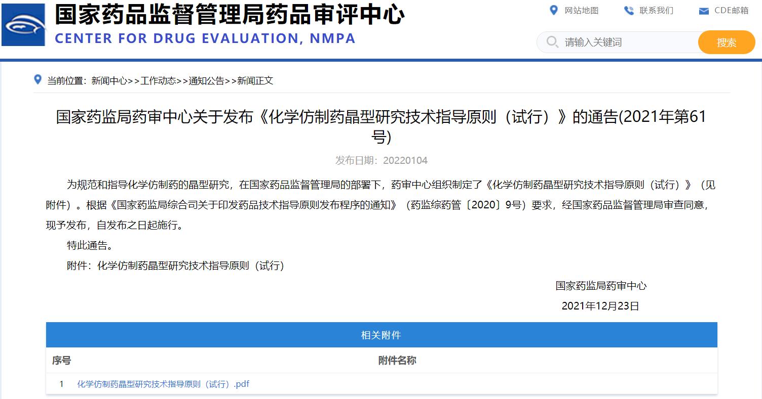 國家藥監(jiān)局藥審中心關(guān)于發(fā)布《化學(xué)仿制藥晶型研究技術(shù)指導(dǎo)原則(試行)》的通告(2021年第61號(hào))