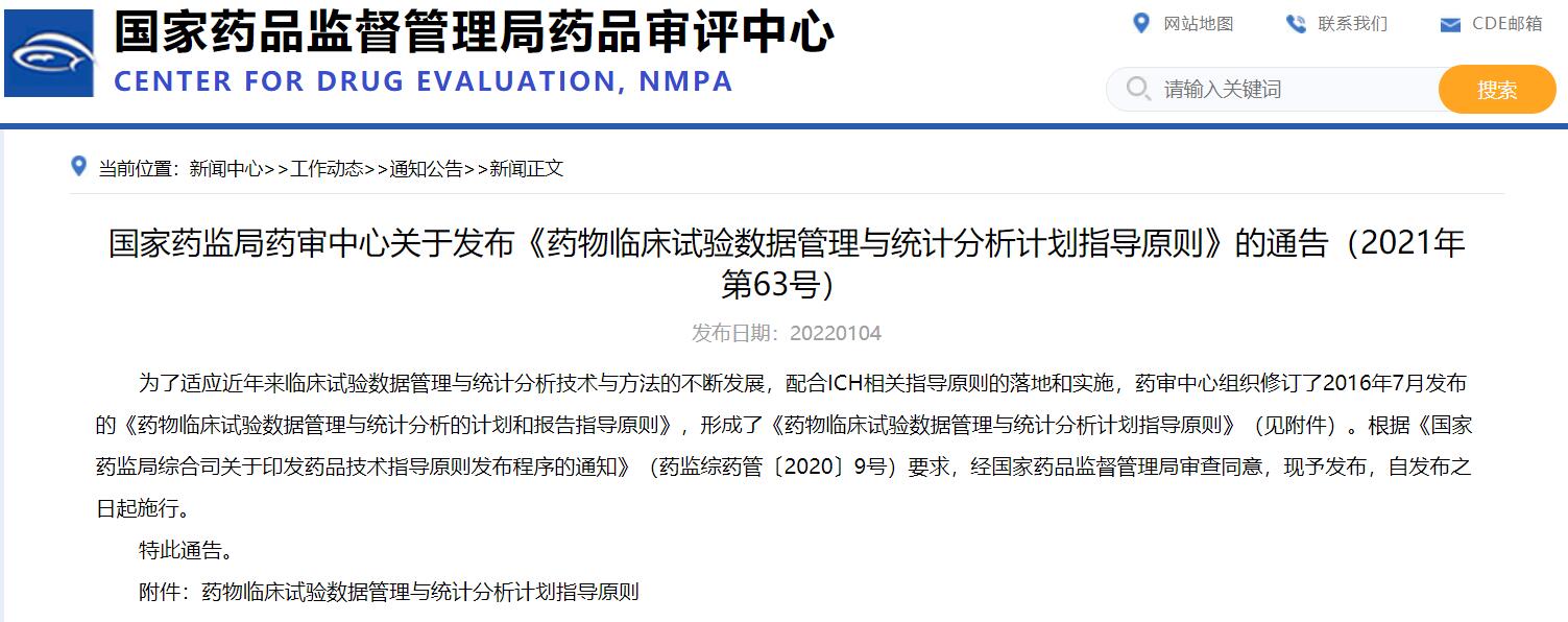 國家藥監(jiān)局藥審中心關(guān)于發(fā)布《藥物臨床試驗(yàn)數(shù)據(jù)管理與統(tǒng)計(jì)分析計(jì)劃指導(dǎo)原則》的通告(2021年第63號(hào))