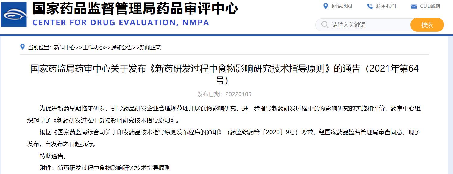 國家藥監(jiān)局藥審中心關(guān)于發(fā)布《新藥研發(fā)過程中食物影響研究技術(shù)指導(dǎo)原則》的通告(2021年第64號(hào))