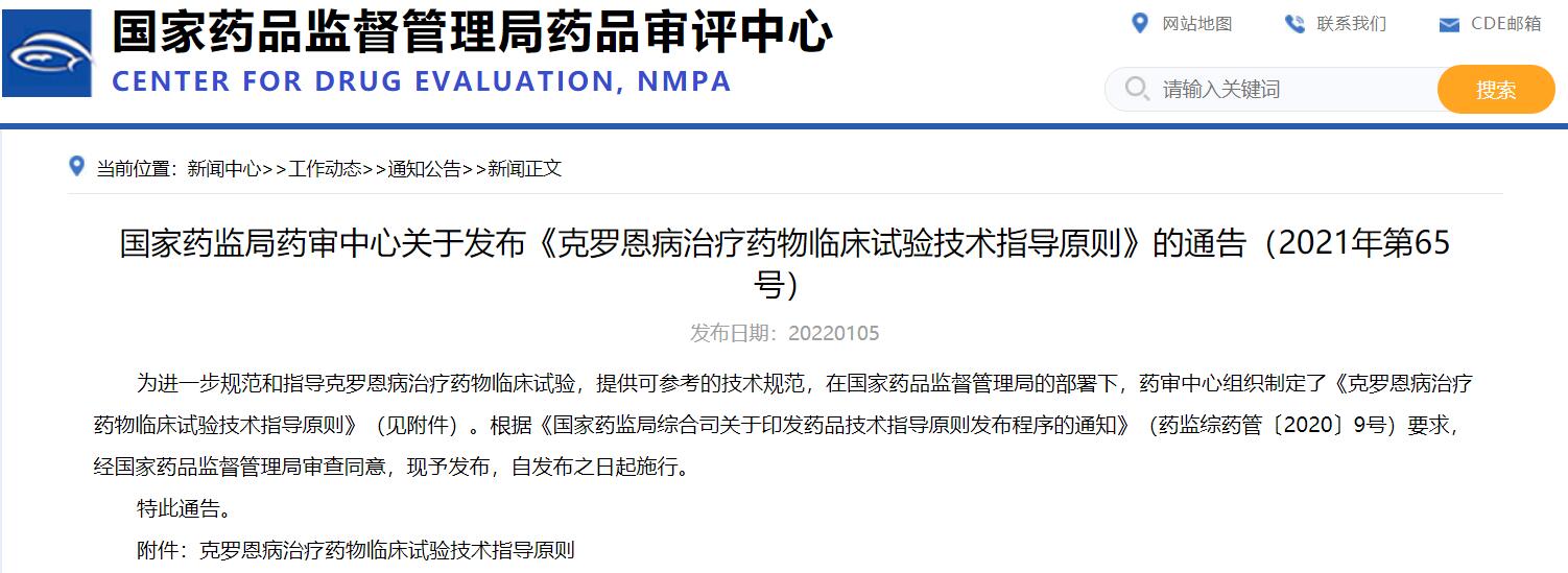 國家藥監(jiān)局藥審中心關(guān)于發(fā)布《克羅恩病治療藥物臨床試驗(yàn)技術(shù)指導(dǎo)原則》的通告(2021年第65號(hào))