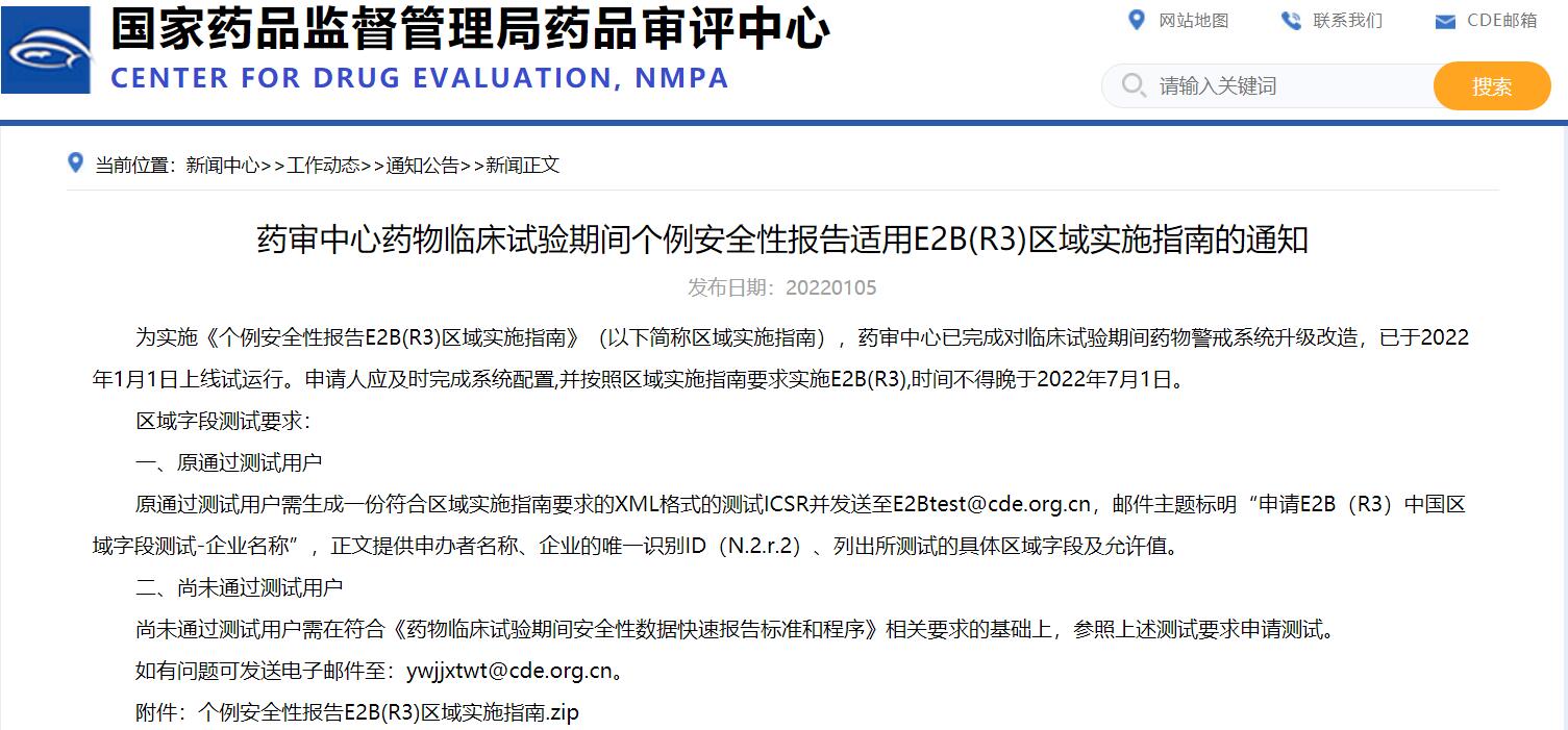 藥審中心藥物臨床試驗(yàn)期間個(gè)例安全性報(bào)告適用E2B(R3)區(qū)域?qū)嵤┲改系耐ㄖ?/span>