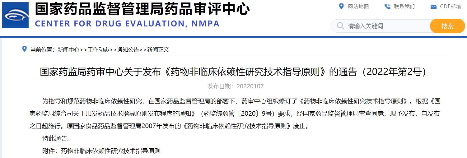 國家藥監(jiān)局藥審中心關(guān)于發(fā)布《藥物非臨床依賴性研究技術(shù)指導(dǎo)原則》的通告(2022年第2號(hào))
