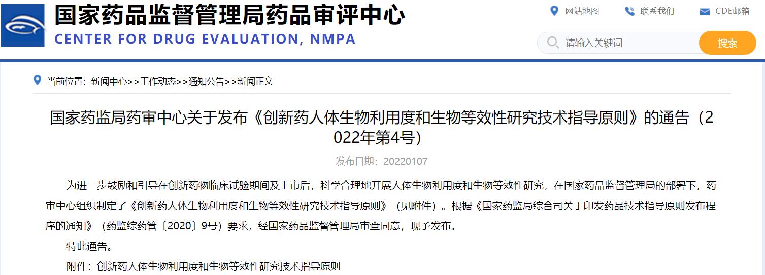 國家藥監(jiān)局藥審中心關(guān)于發(fā)布《創(chuàng)新藥人體生物利用度和生物等效性研究技術(shù)指導(dǎo)原則》的通告(2022年第4號(hào))
