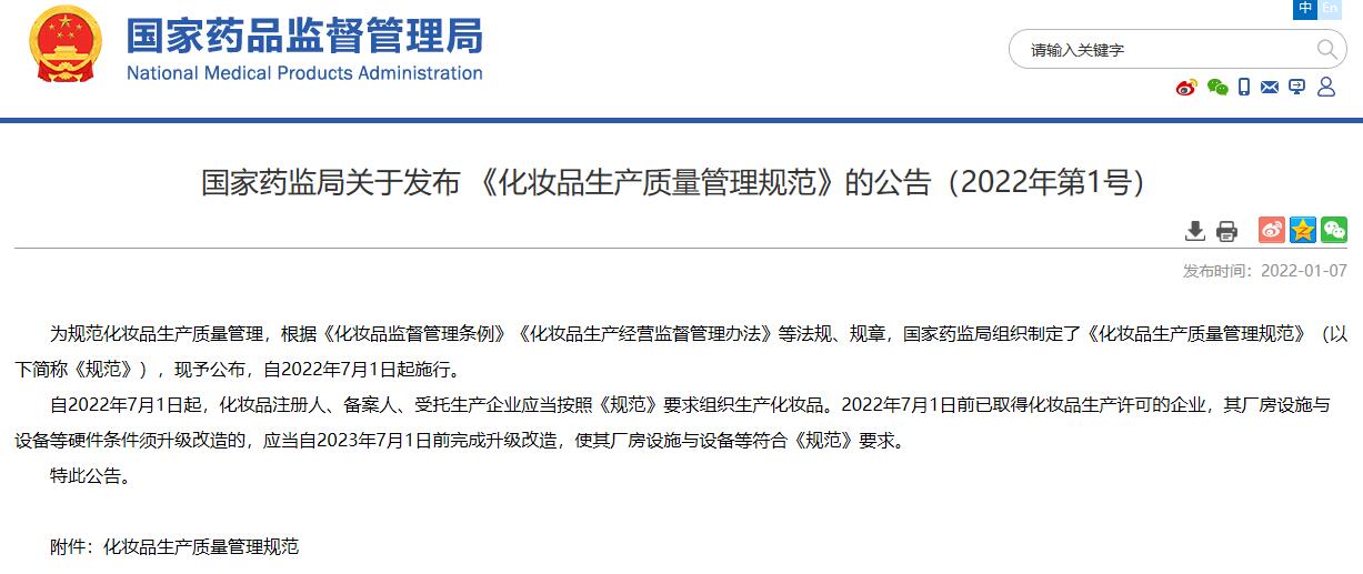 國家藥監(jiān)局關(guān)于發(fā)布 《化妝品生產(chǎn)質(zhì)量管理規(guī)范》的公告(2022年第1號(hào))