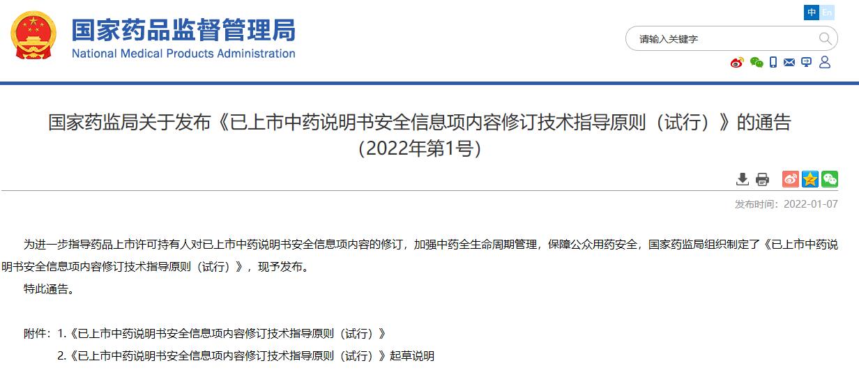 國家藥監(jiān)局關(guān)于發(fā)布《已上市中藥說明書安全信息項(xiàng)內(nèi)容修訂技術(shù)指導(dǎo)原則(試行)》的通告 (2022年第1號(hào))